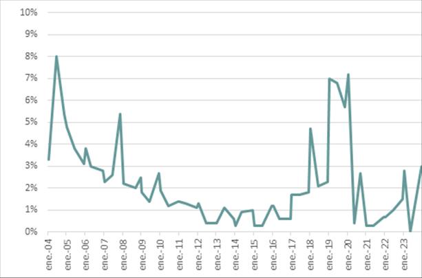 As for the CIS data on violence against women, which is how this concern is referred to, petitions amount to over 3% between January 2004 and April 2006, June 2007, January 2018, and between January 2019 and January 2020. As can be seen in Figure 1, the two highest peaks are June 2004 with 8% and January 2020 with 7.2%. Possible explanations for these two peaks may be, in the first case, that it was the month in which the draft of the subsequent Organic Law on Comprehensive Protection Measures against Gender Violence was passed, so the population was exposed to the issue; and, in the second case, that since 2018 there were years of massive feminist protests that drew the attention of the general population.