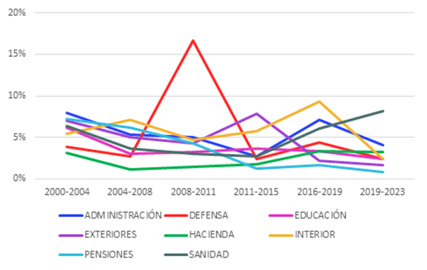 On the other hand, more pronounced peaks can be seen in 'Defense' in 2008-2011, in 'Foreign Affairs' in 2011-2015, and in 'Administration' and 'Domestic Affairs' in 2016-2019. In the latter two, no single initiative stands out, so no common theme can be discerned. However, in 'Foreign Affairs', a large number of the initiatives were related to the request by parents to draw up a manifesto repudiating the events that led to the death of their son in a psychiatric prison in Argentina. On the other hand, when looking at 'Defense', most of the petitions refer to the modification of certain aspects of Law 39/2007, of 19 November, on military careers. This large influx may be due to the fact that the State Security Forces and Corps are not allowed to form associations, so they must submit petitions on an individual basis. This would be the only case that we have been able to verify in which a collective rather than an individual improvement is sought.