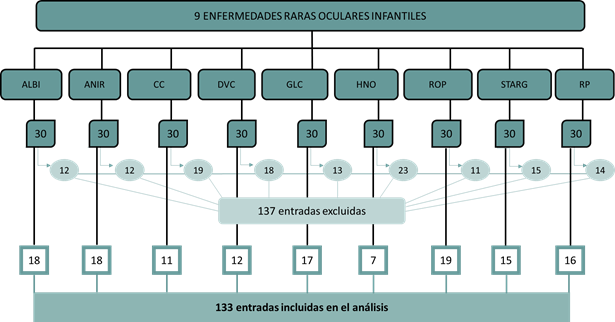 Source: Own elaboration (ALBI, albinism; ANIR, aniridia; CC, congenital cataract; DVC, cerebral visual impairment; GLC, congenital glaucoma; HNO, optic nerve hypoplasia; ROP, retinopathy of prematurity; STARG, Stargardt disease, RP, retinitis pigmentosa).