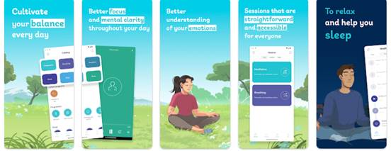 Las Figuras 1, 2 y 3 muestran las principales funciones que ofrecen las apps Balance, Meditopia e Insight Timer:
