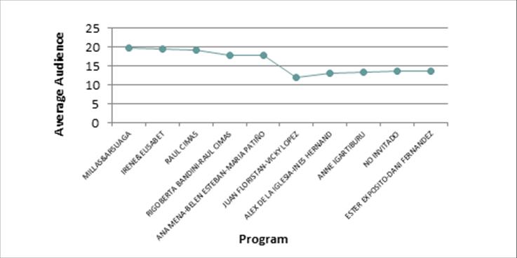 The combination of entertainment and celebrities appears to be a successful formula, as does the ever-present humour. The strong audience results of Raúl Cimas and Belén Esteban stand out in general. Greater audience interest in male guests is observed. It is confirmed that guests are an important factor in attracting or retaining viewers, though the descriptive study presented here does not allow for the assertion that the programme’s success depends solely on the choice or success of the guest or guests.