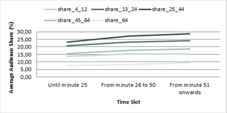 By age cohort (Table 2), the 25–44 age group exhibits the highest average viewership of La Revuelta (data in the final row of Table 2), followed, in descending order of average viewership, by the 13–24 age group, the 45–64 age group, the 4–12 age group, and, lastly, the 65+ age group.