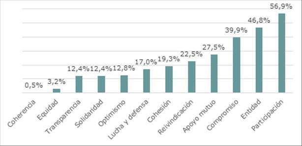 Las temáticas más frecuentes en las publicaciones de las asociaciones incluyen actividades relacionadas con las MPN (61,5%) y noticias y actualizaciones (26,6%). Le siguen, a más distancia: información básica sobre la enfermedad (14,7%), motivación con recursos y apoyo (11%) y tratamientos (6,9%). Con un porcentaje igual o inferior al 5% se encuentran temáticas tales como estilo de vida, información extendida, participación en investigación o información de cada uno de los tres cánceres que conforman MPN (TE, PV y MF). Estas temáticas no siempre están alineadas con los intereses y necesidades de los pacientes y sus familias. Como se ha visto anteriormente, los encuestados demandan información más específica o sobre estilo de vida. Cada una de las publicaciones encontradas tanto en Facebook como en Instagram han sido clasificadas según los valores que transmitían (Ver figura 3). Los valores más frecuentes son participación (56,9%), entidad (46,8%) y compromiso (39,9%). Por ejemplo, una publicación con una llamada a un seminario con sanitarios expertos fue clasificado como «participación» y «compromiso y los testimonios de pacientes sobre su día a día como «entidad» y «apoyo mutuo»; mientras que otra sobre la necesidad de más investigación fue etiquetada como «reivindicación» y «lucha y defensa». Estos valores son fundamentales para fomentar un sentido de comunidad entre los pacientes y sus familias.
