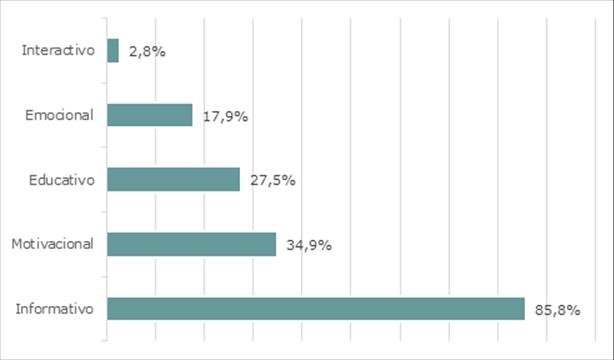 El análisis de contenido de las publicaciones de las asociaciones muestra que el nivel de interacción y engagement varía según el tipo de contenido y la temática. El tono y estilo (Ver gráfico 4) de la mayoría de publicaciones analizados es informativo (85,8%), seguido de motivacional y educativo. En menor medida se encuentran las publicaciones emocionales e interactivas.