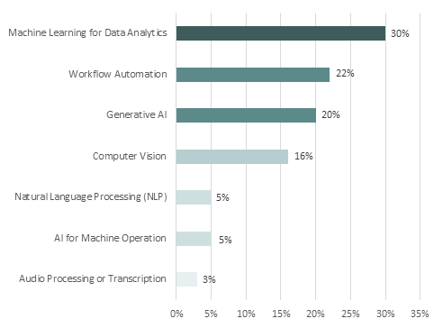 In this regard, it is pertinent to note how Spanish SMEs are utilizing artificial intelligence. Figure 2 illustrates the primary use cases, where marketing and sales occupy the second position (33%), followed by research and development (40%). These data reinforce the importance of studying the communicative impact of AI in emerging business contexts. Furthermore, Figure 3 illustrates which technologies are being used most frequently. Machine learning applied to data analytics (30%), workflow automation (22%), and generative AI (20%) predominate, all of which have a strong communicative component, particularly in processes such as personalization, automated content creation, and real-time decision-making.