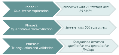 This study adopts a mixed-methods approach, specifically a sequential exploratory design (DEXPLOR-S), with the aim of comprehensively analyzing the impact of AI on the persuasive communication strategies developed by startups and SMEs. This approach combines qualitative and quantitative methods, allowing for the evaluation of both objective indicators—such as conversion, engagement, and degree of personalization—and subjective perceptions, attitudes, and barriers to the adoption of AI-based systems. The fieldwork was conducted between July 2024 and January 2025. The methodological sequence begins with a qualitative phase aimed at exploring in depth the practices, strategies, and concerns of marketing and communication managers. Based on the emerging findings, a subsequent quantitative phase was designed to validate and expand them through a structured survey administered to consumers (Creswell & Plano Clark, 2017). This design enables effective data triangulation and strengthens the analytical validity of the study by complementarily integrating the perspectives of the business environment and the user experience (Torres-Toukoumidis et al., 2024).
