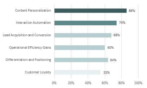 As shown in Figure 5, the strategic objectives most frequently cited by the marketing managers interviewed revolve around three main axes: user experience personalization (86%), interaction automation (74%), and the improvement of metrics such as lead acquisition and conversion (68%).