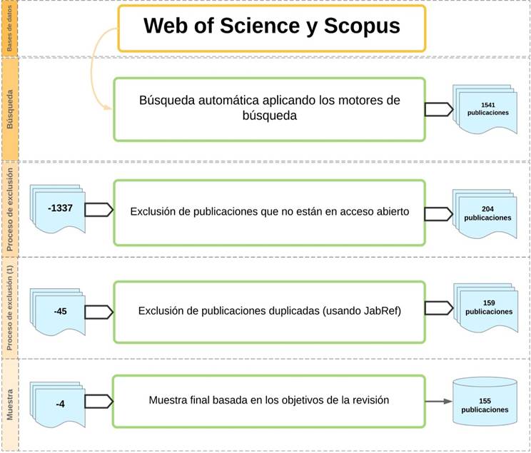 Siguiendo las recomendaciones Kitchenham (2007), el proceso de selección se realizó mediante un enfoque por etapas secuenciales. Es importante enfatizar que en esta etapa se excluyeron los estudios que no estaban claramente relacionados con el dominio de conocimiento comunicación de las ciencias sociales, estableciendo la exploración inicial e identificando 1541 publicaciones en la búsqueda automática —criterio 1, 2 y 3—. De estos 1541 estudios, 1337 (86, 76%) no estaban en acceso abierto —criterio 4— y 45 (2,92%) estaban duplicados. Los 159 estudios restantes se verificaron según los objetivos de investigación, y se excluyeron 4 (0,26%) —criterio 5—, para una muestra de 155 (10,06%) publicaciones (ver figura 1).