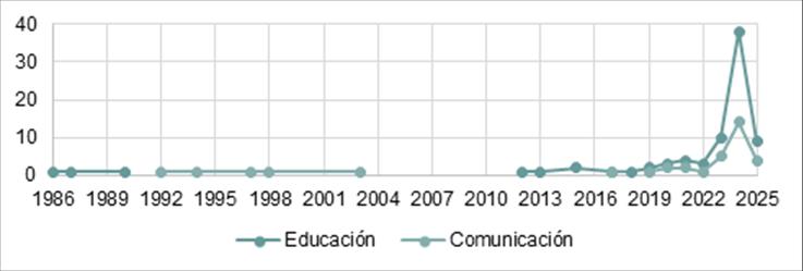 En relación con la fecha de publicación, se identificaron artículos desde los años 80 en las áreas estudiadas. Concretamente, los primeros estudios hallados en el ámbito educativo se publicaron en 1986, mientras que, en el comunicativo, el primer estudio data de 1992. Sin embargo, hasta 2018, la publicación de investigaciones sobre IA y discapacidad en comunicación y educación se limitaba a uno o dos estudios por año. El interés por este tópico se produce a partir de esta fecha, cuando los estudios comienzan a aumentar hasta llegar a 15 en 2023 y 52 en 2024. Estos datos muestran que, aunque se hayan hallado estudios en un período que abarca 40 años, un 45,6% de ellos se publicaron en 2024, y un 70,2% en los últimos tres años, teniendo en cuenta además que el año 2025 solamente aparece representado hasta marzo (Figura 2).