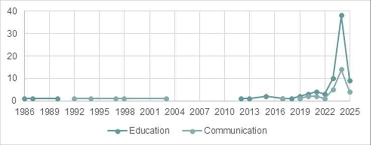 Regarding publication dates, studies in the analyzed fields were identified as early as the 1980s. Specifically, the first research in the educational domain was published in 1986, while the earliest study in communication dates to 1992. However, until 2018, research on AI and disability within communication and education remained limited, with only one or two studies published per year. Interest in this topic increased notably from that point onward, with the number of publications rising to 15 in 2023 and 52 in 2024. These figures indicate that, although studies were identified over a 40-year period, 45.6% were published in 2024 and 70.2% within the last three years—bearing in mind that data for 2025 extend only to March (Figure 2).